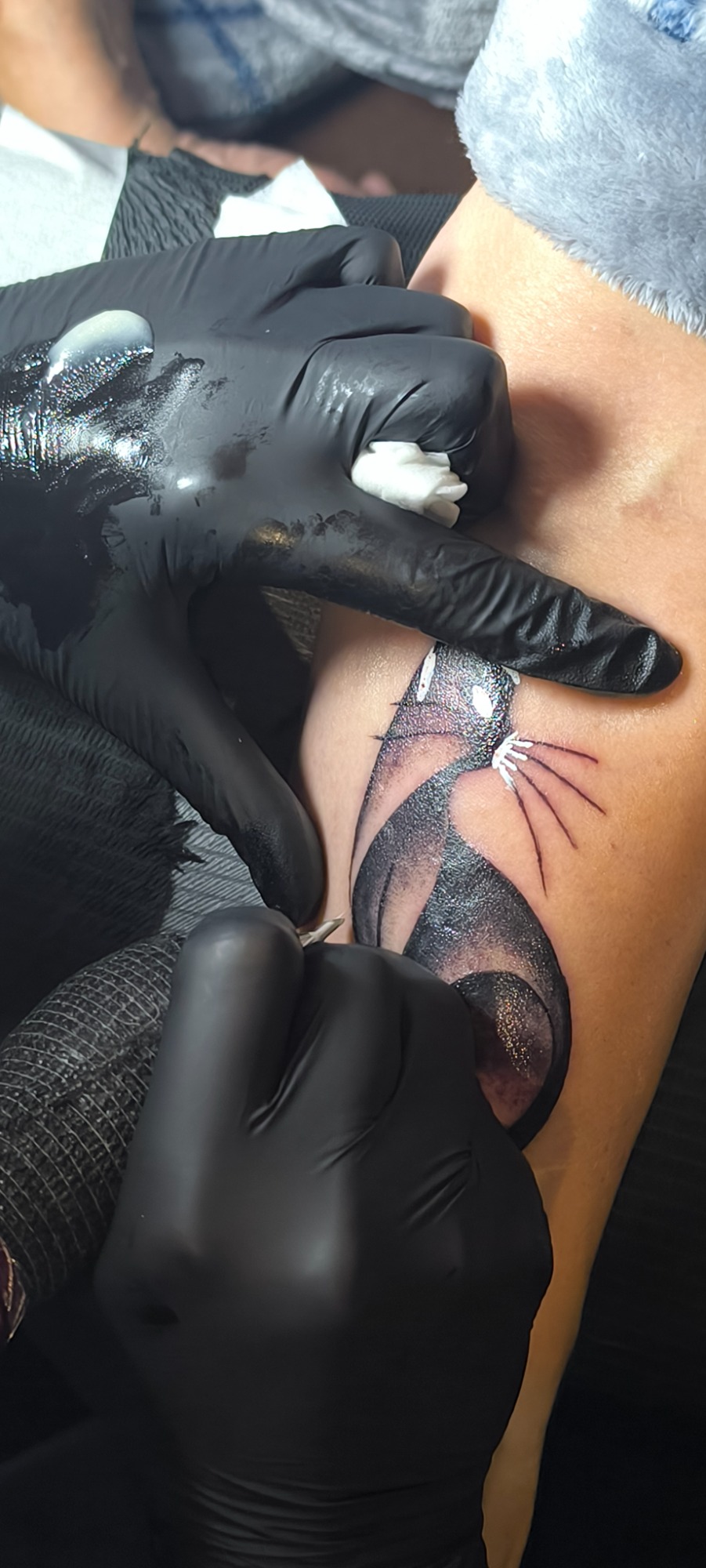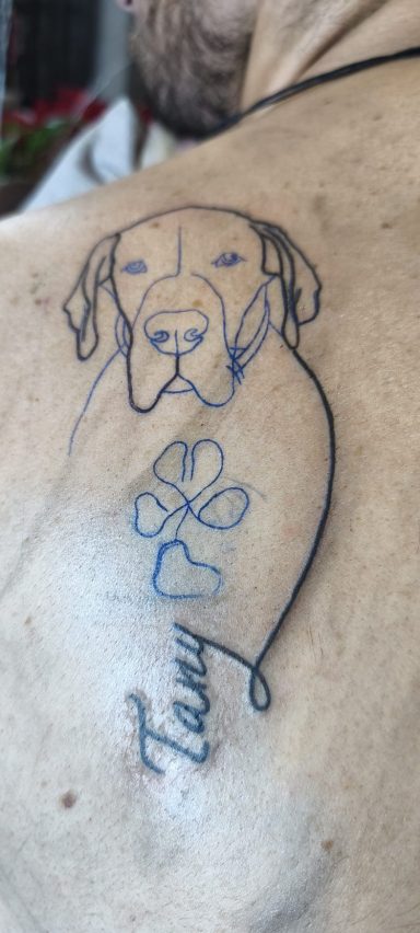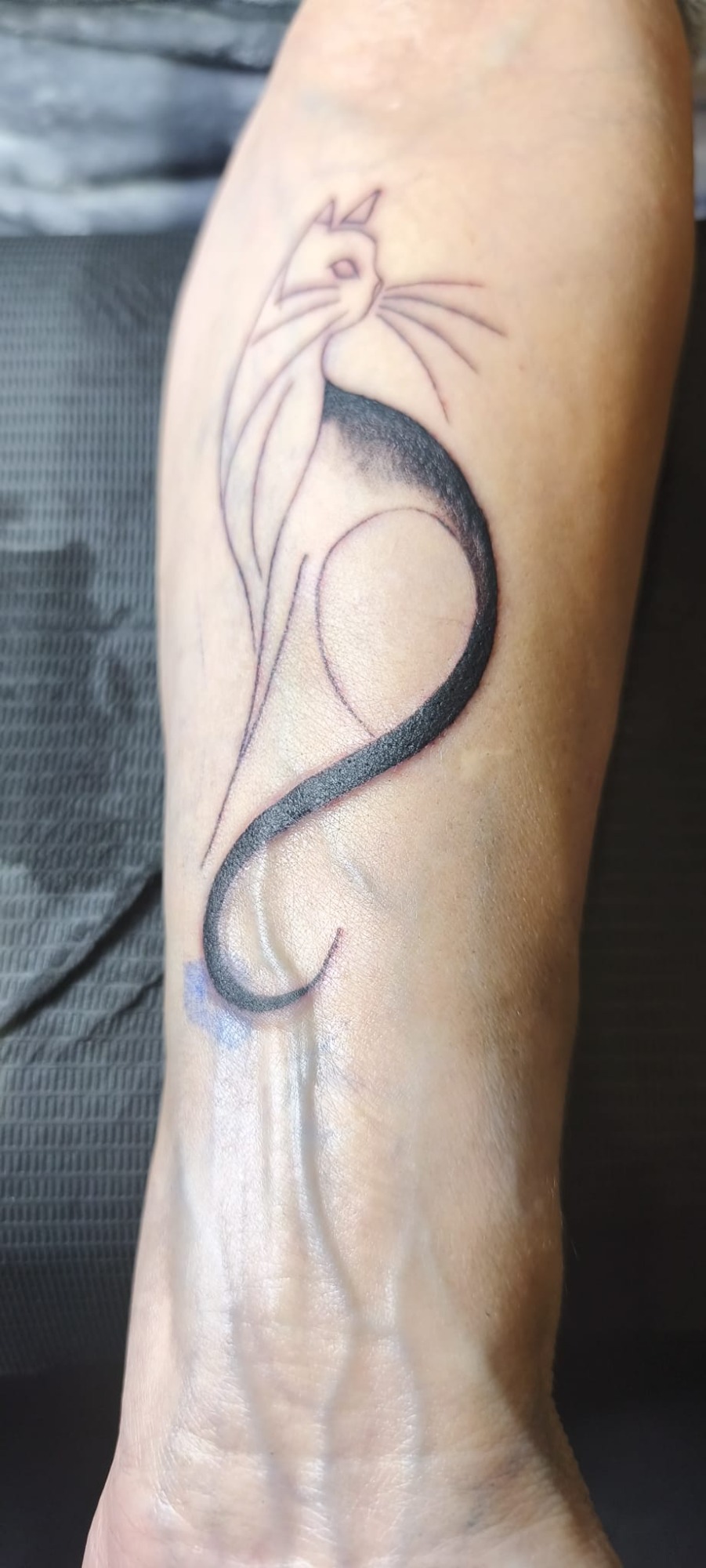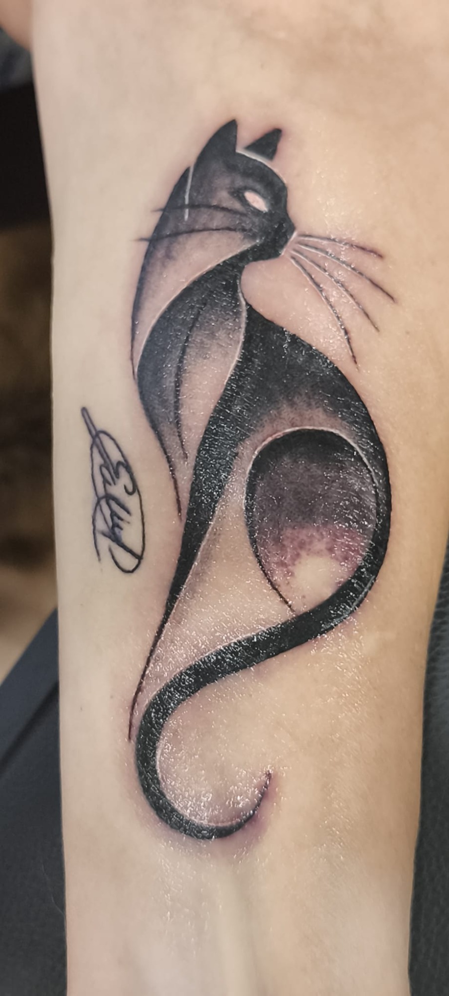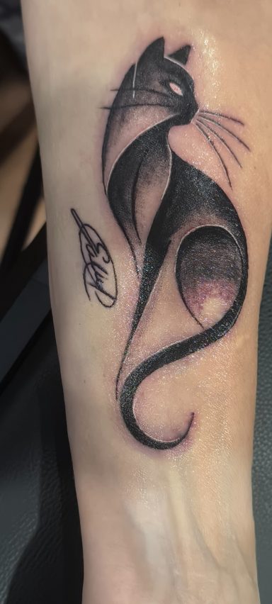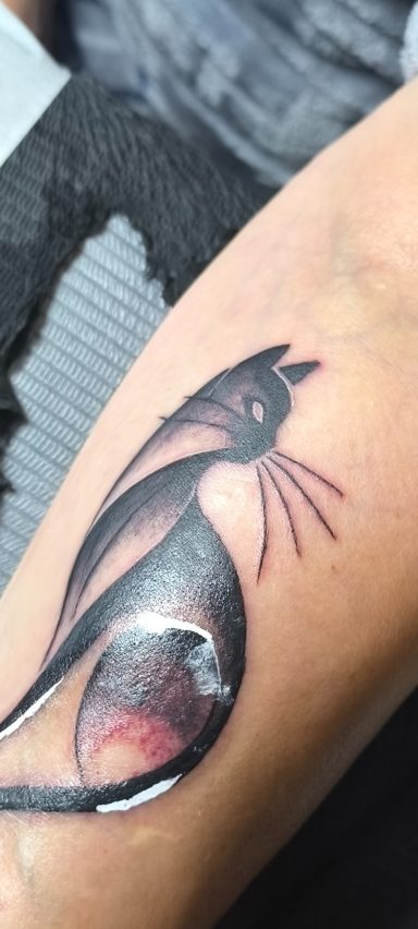 Eva Elena, nueva clienta, acabamos un tatuaje anterior que estaba incompleto (La estrella, su marido desde el cielo) y un tatuaje nuevo, un gato negro. (MI MADRE)