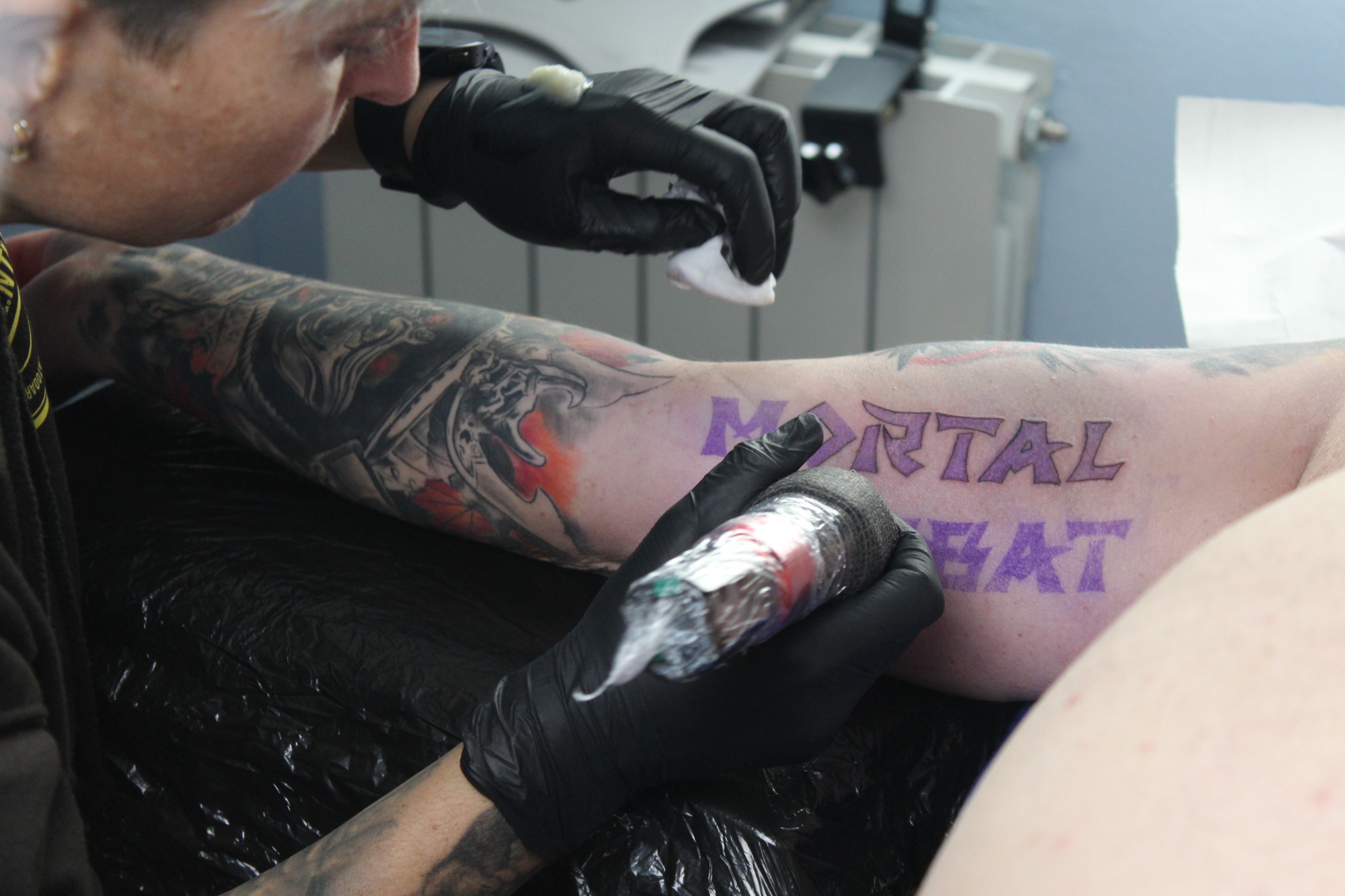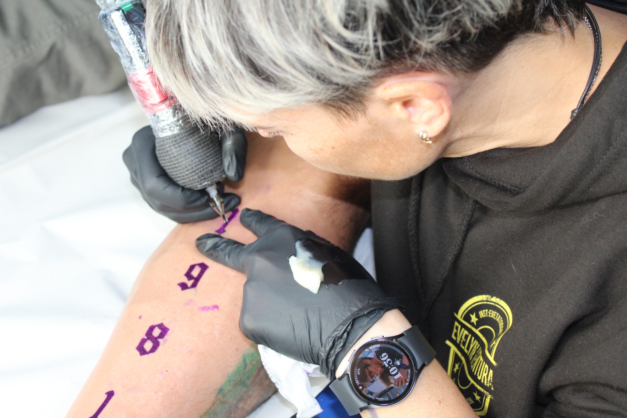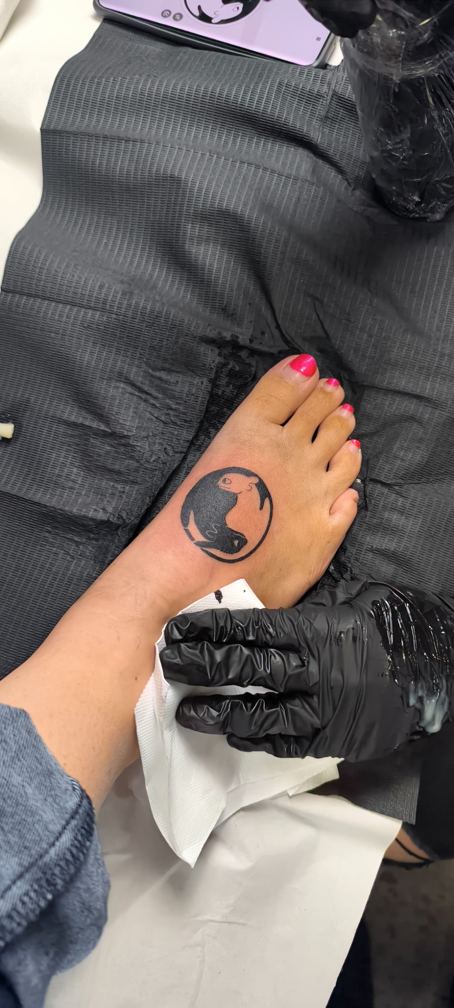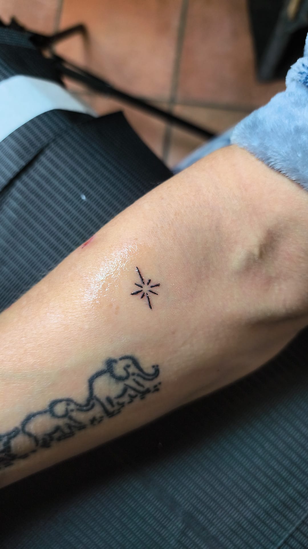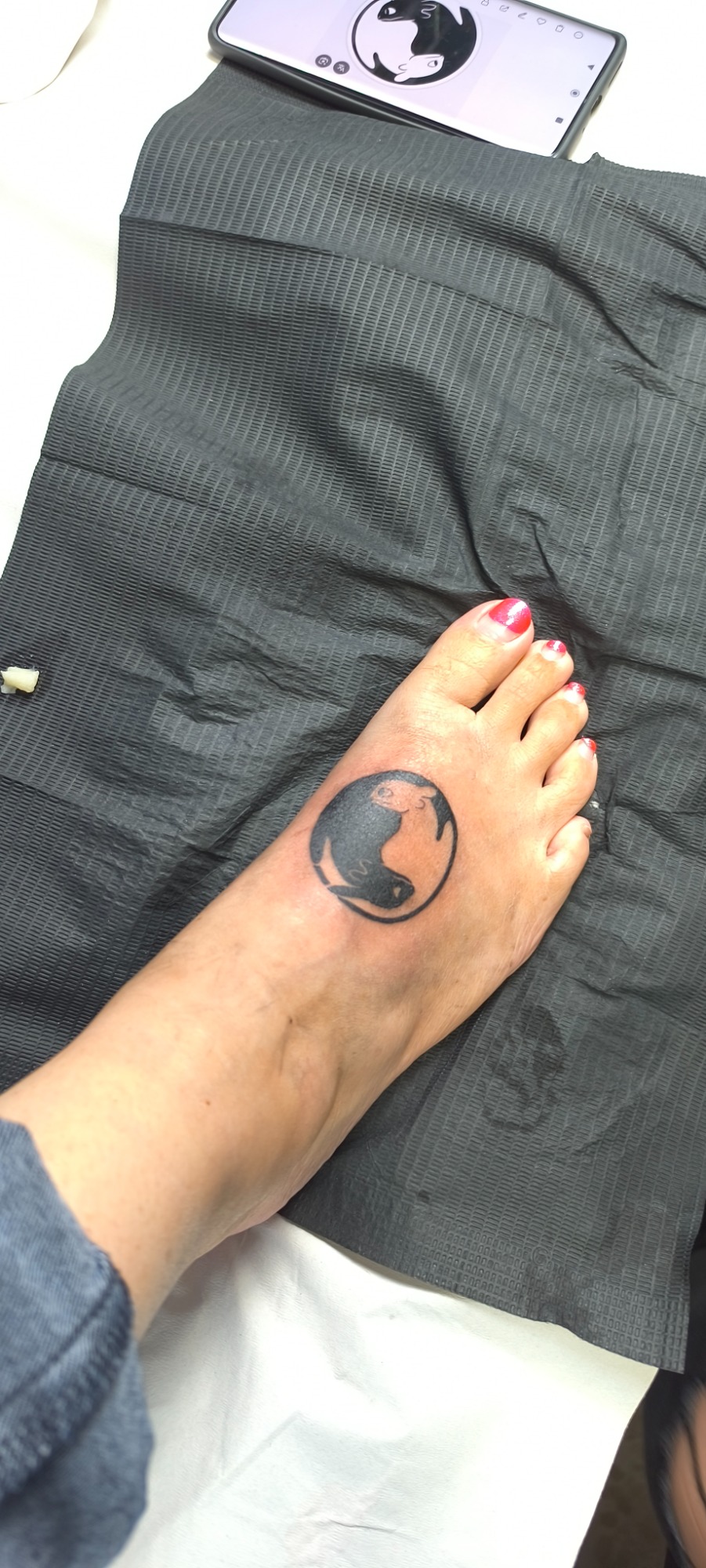 Eva Elena, nueva clienta, acabamos un tatuaje anterior que estaba incompleto (La estrella, su marido desde el cielo) y un tatuaje nuevo, un gato negro. (MI MADRE)